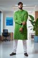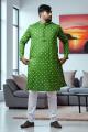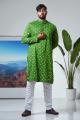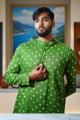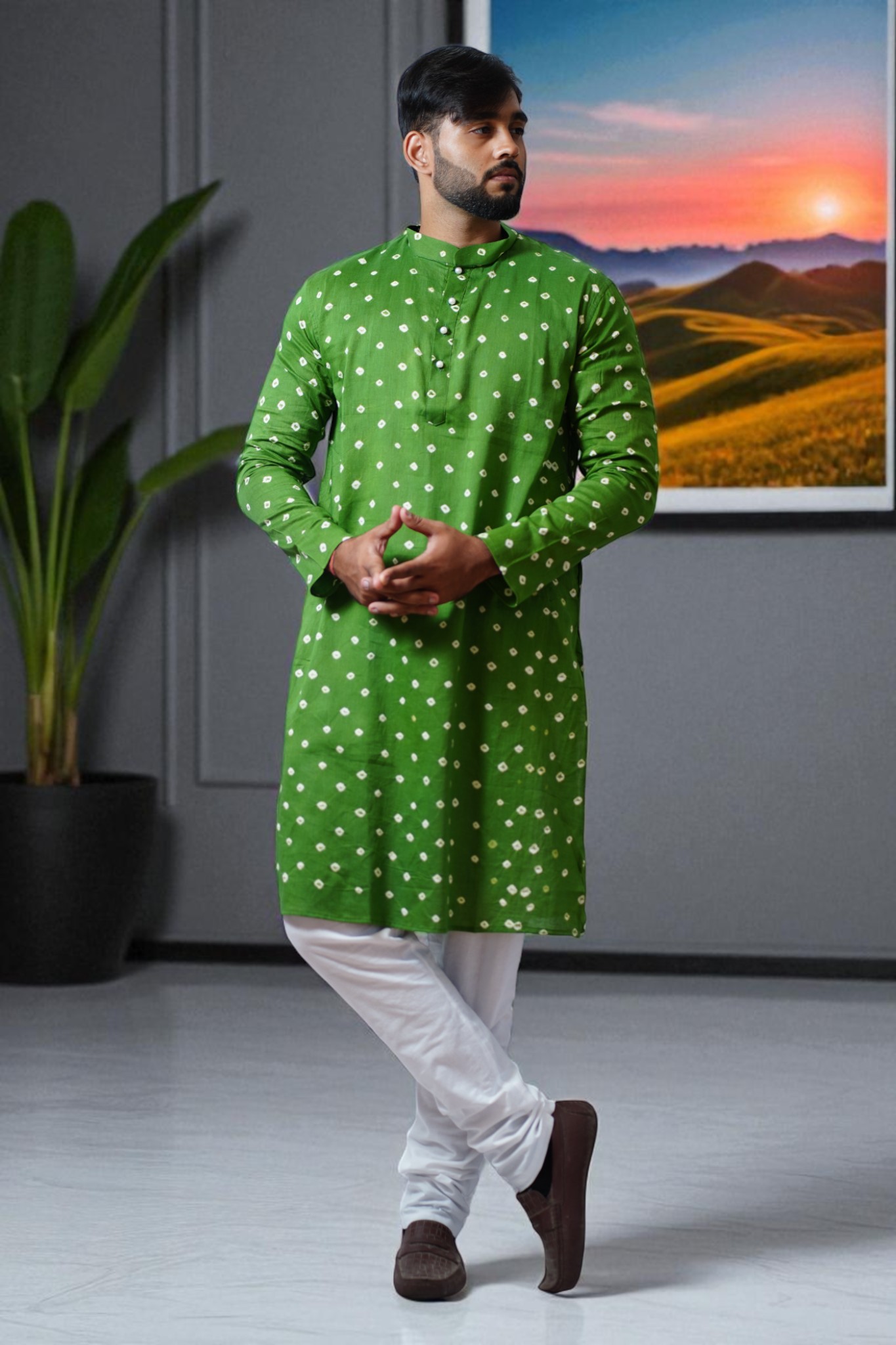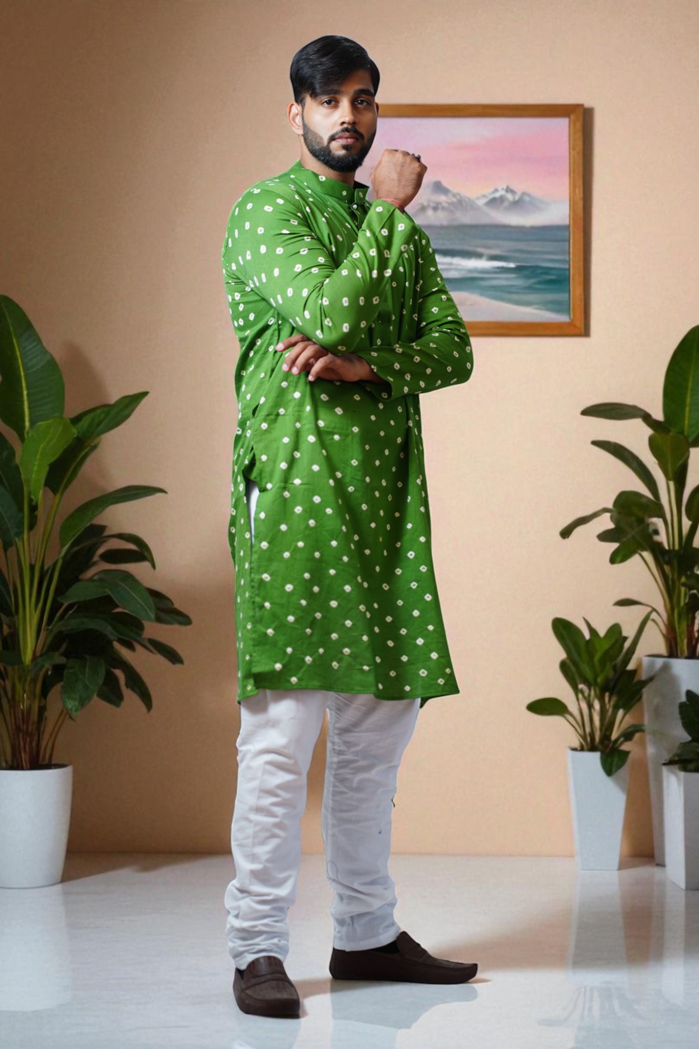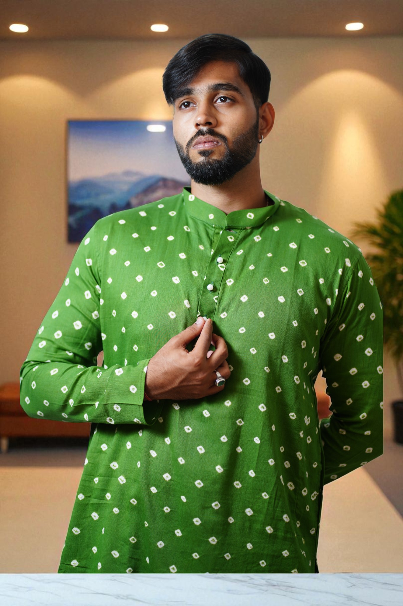Elevate your ethnic wardrobe with this stylish men's Bandhani kurta, crafted from soft, breathable 100% cotton for all-day comfort. Featuring a traditional Bandhani print, this kurta blends timeless design with modern detailing. The sleek Mandarin collar and full sleeves offer a sophisticated look, while the two functional side pockets add practicality without compromising style. Perfect for festive occasions, casual gatherings, or cultural events, this kurta pairs effortlessly with churidar pants, jeans, or trousers.