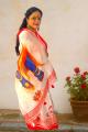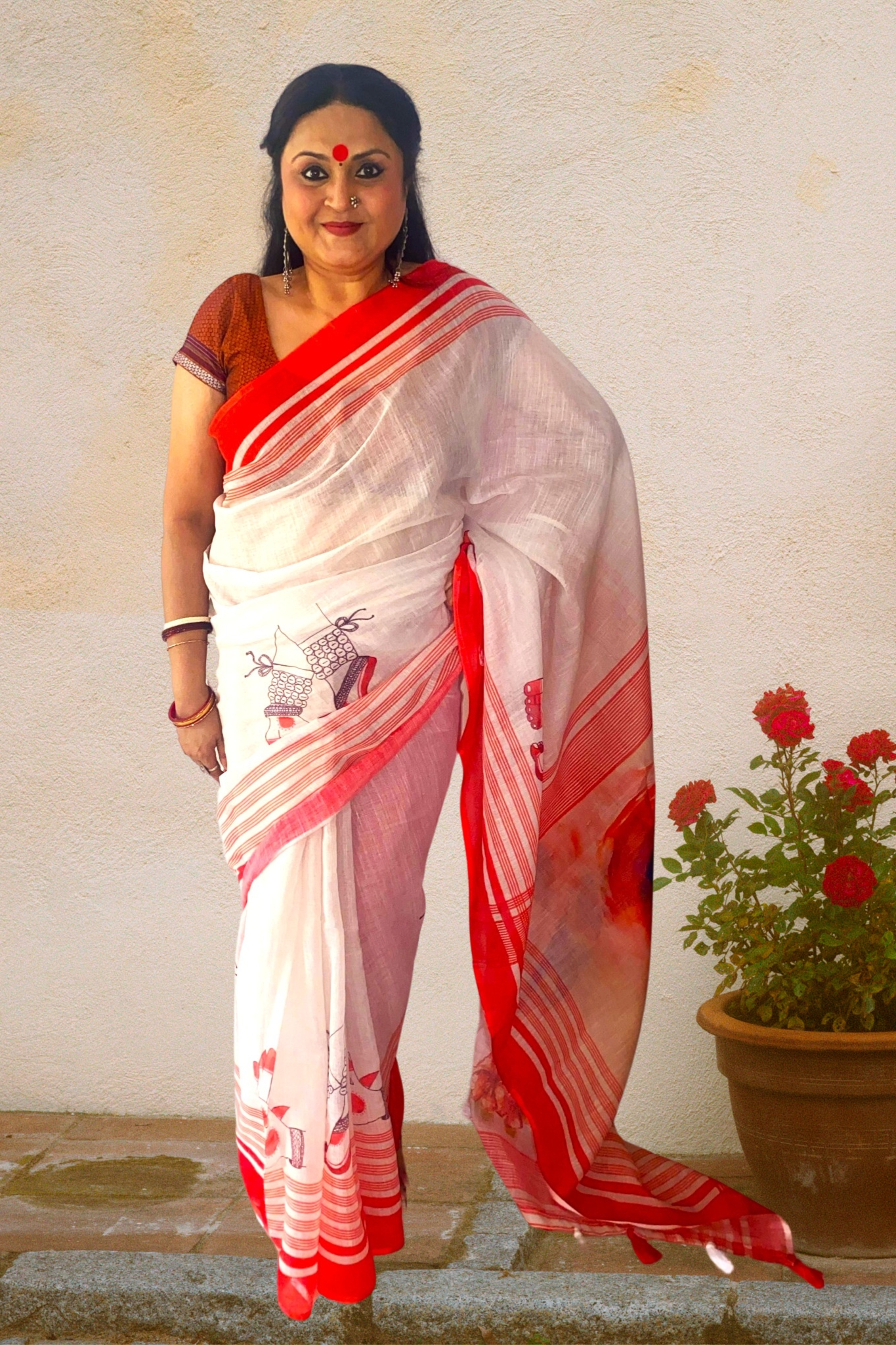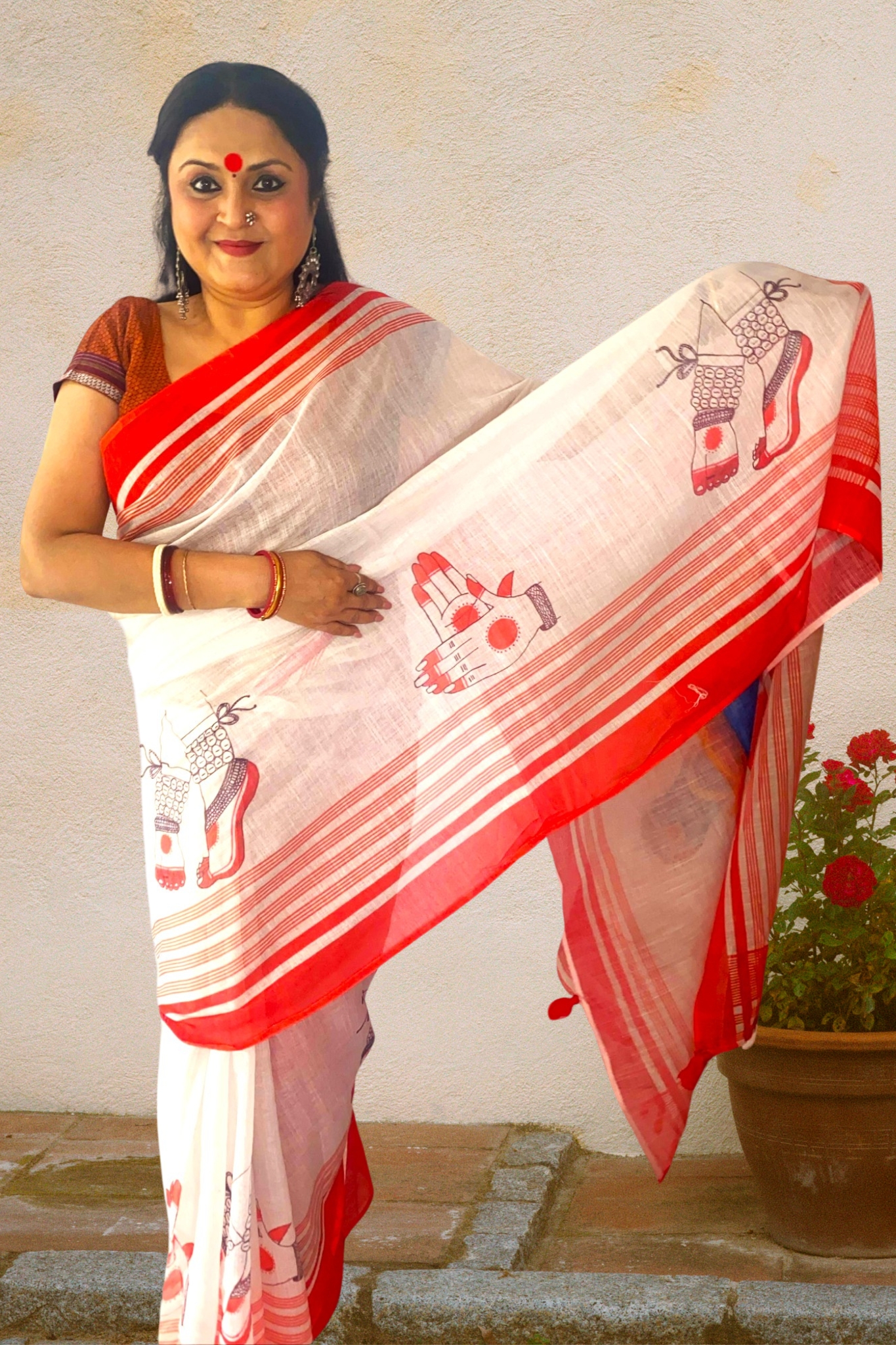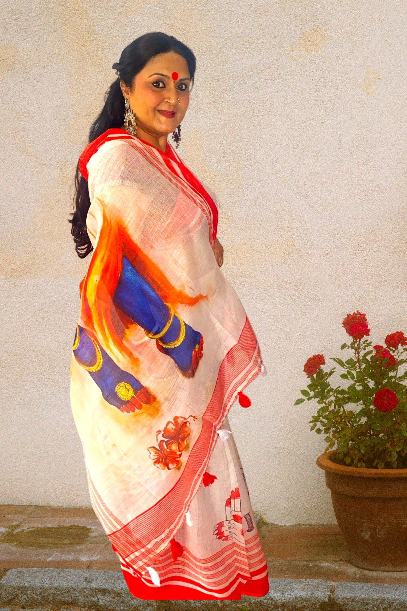 A pure cotton white saree with a red border, featuring artistic prints of Goddess Durga's blue feet, floral motifs, and a blessing hand. Lightweight, traditional, and perfect for puja and festive occasions.