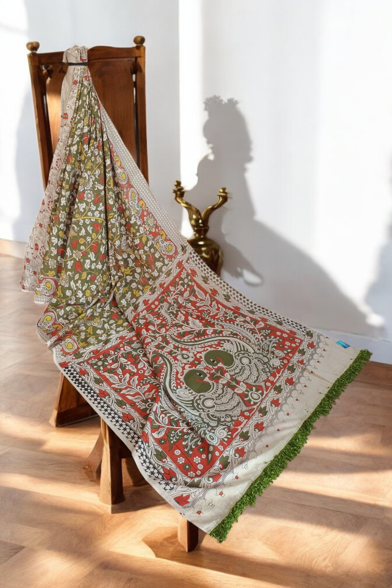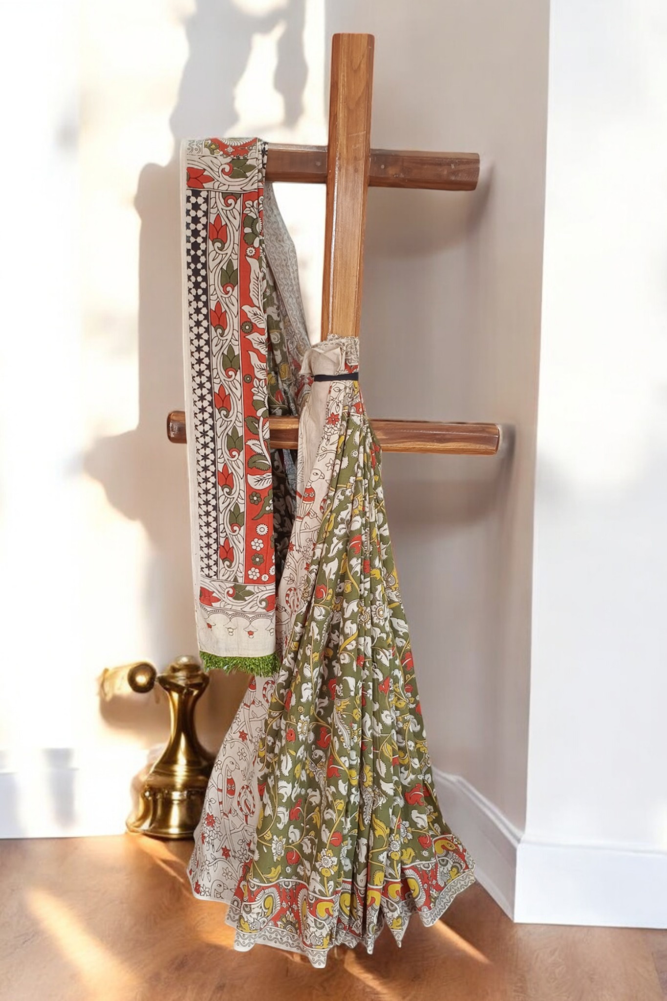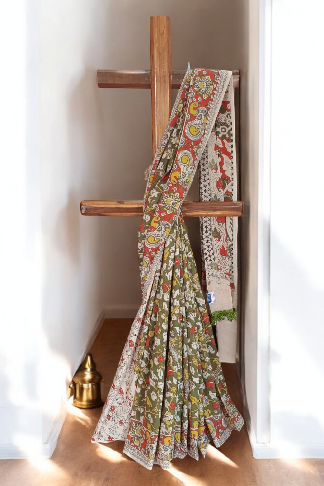 Tradition Woven in Olive Hues-An elegant olive green cotton saree with traditional Kalamkari hand block prints.