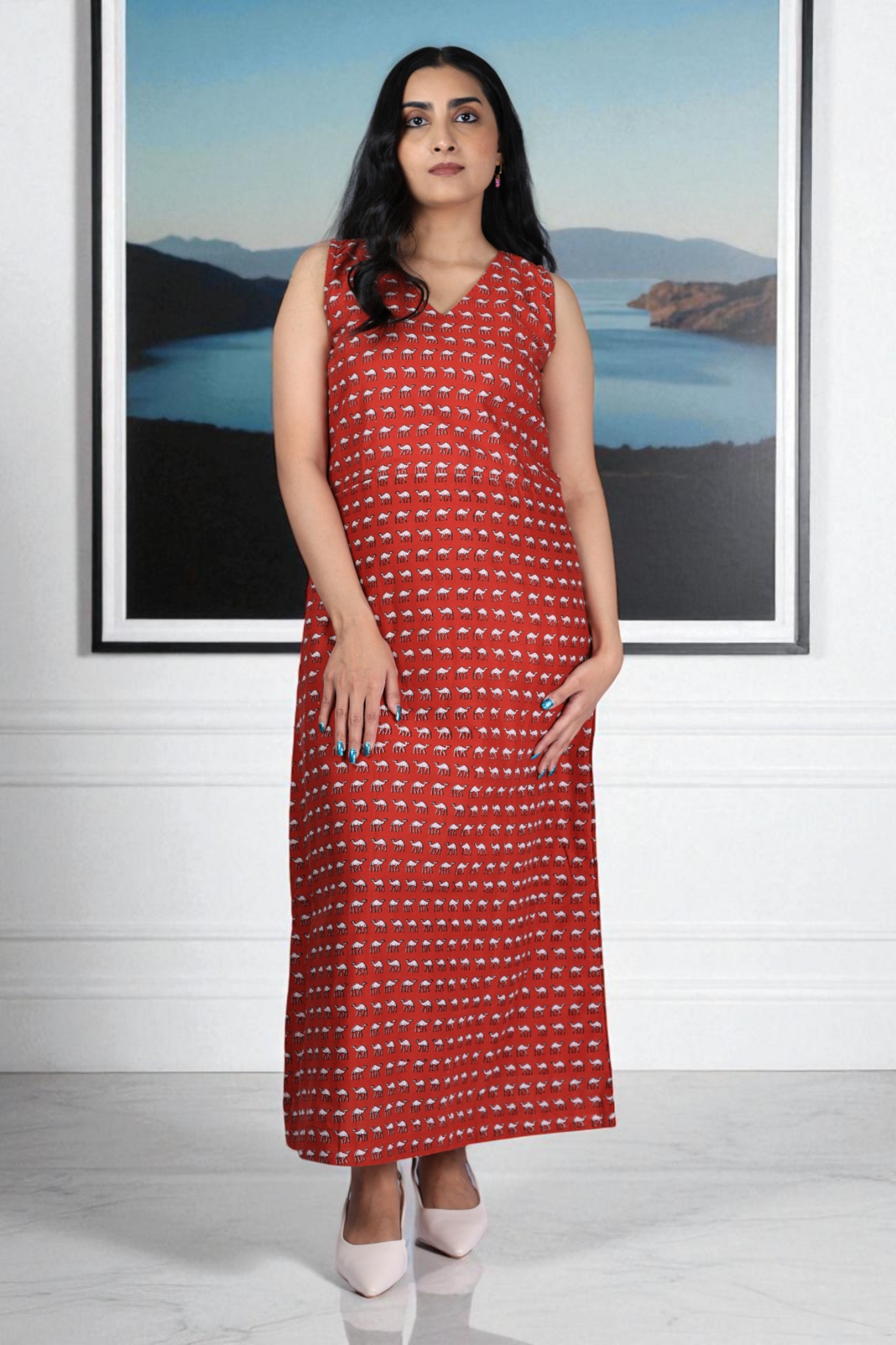Length: Long dress, falls below the calves