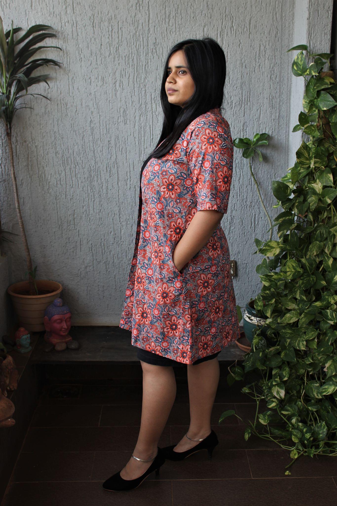 Grace in Every Block - Naturally Beautiful, Effortlessly You-A breezy cotton shrug with peach-orange floral block print and handy side pockets, perfect for everyday elegance.