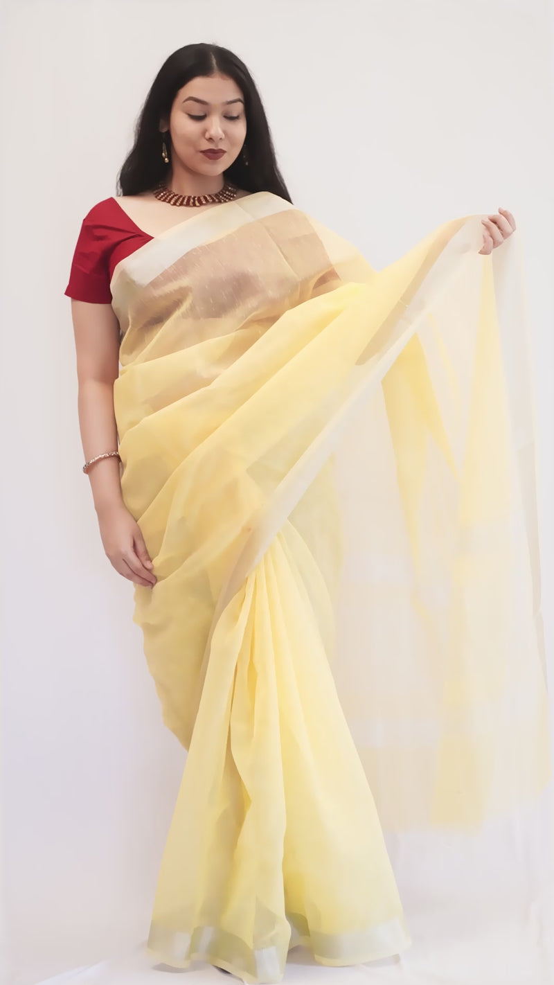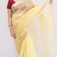 Sunlit Simplicity with a Silver Lining - A radiant yellow Banarasi linen saree with a subtle silver zari border—lightweight, elegant, and perfect for day-to-evening wear.