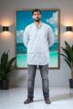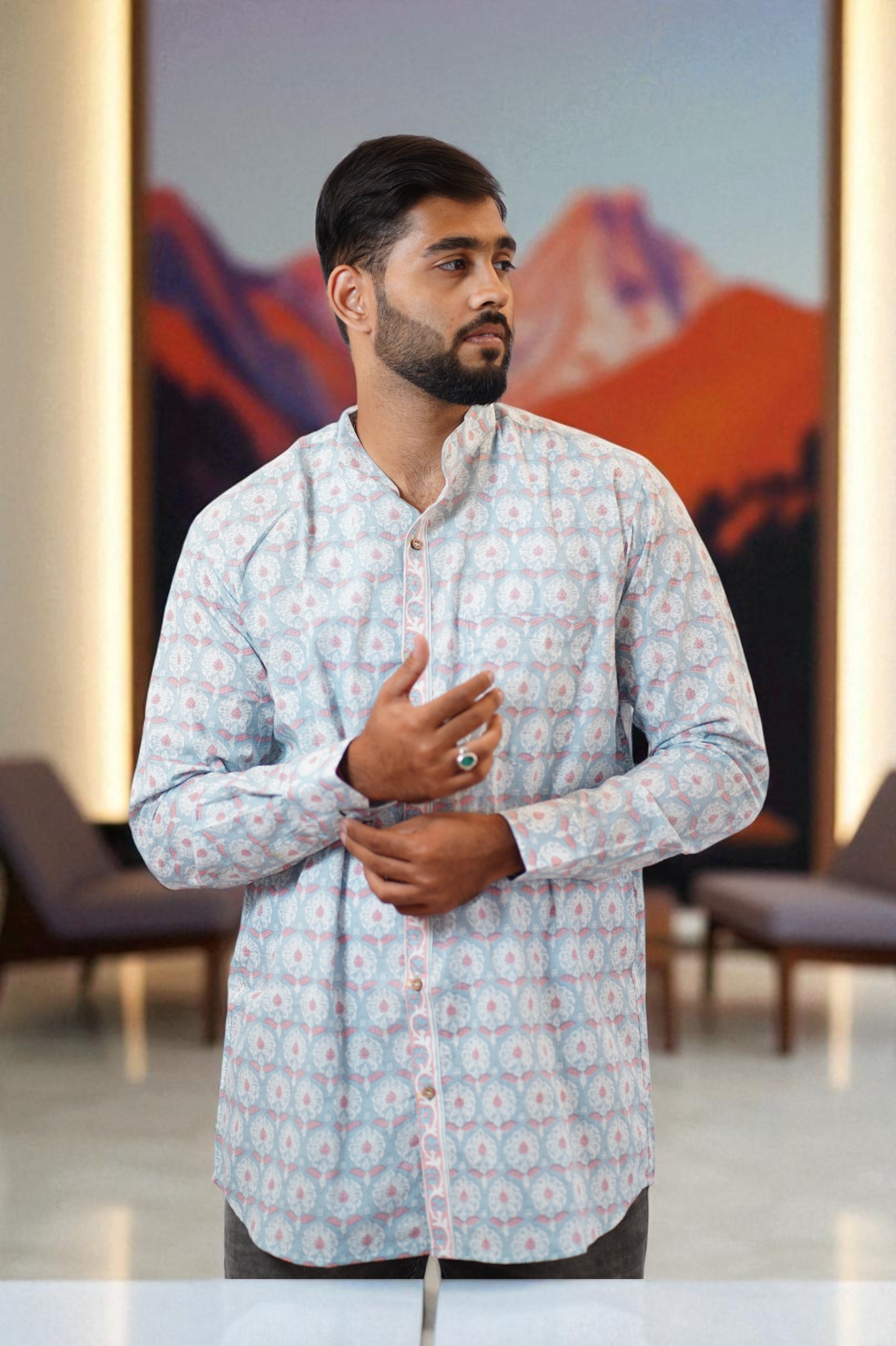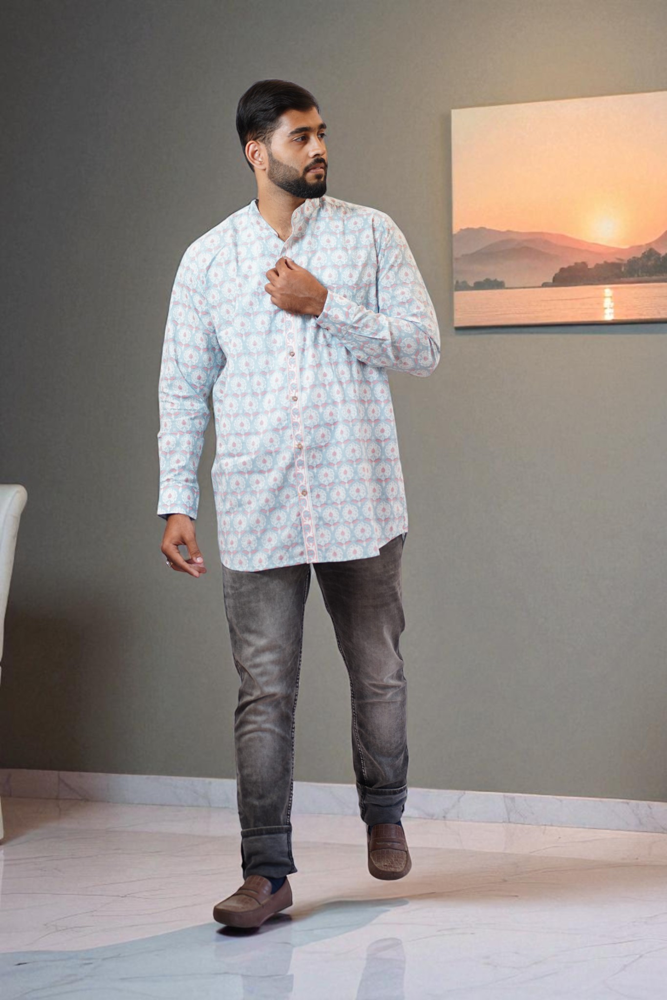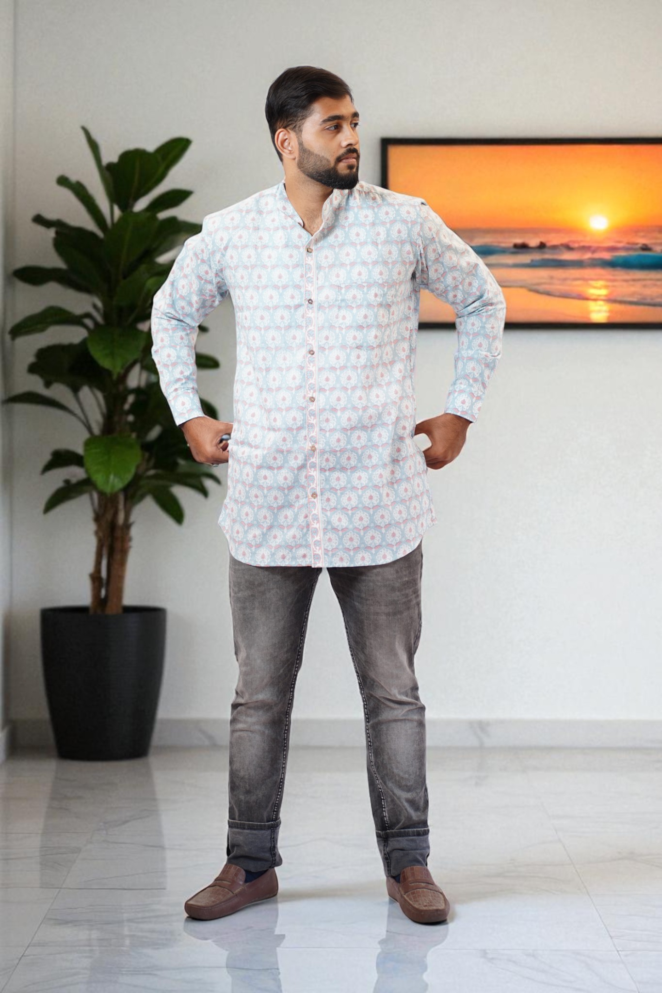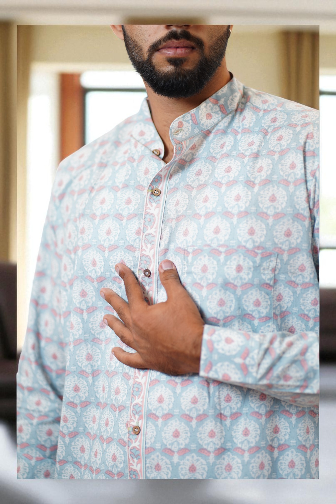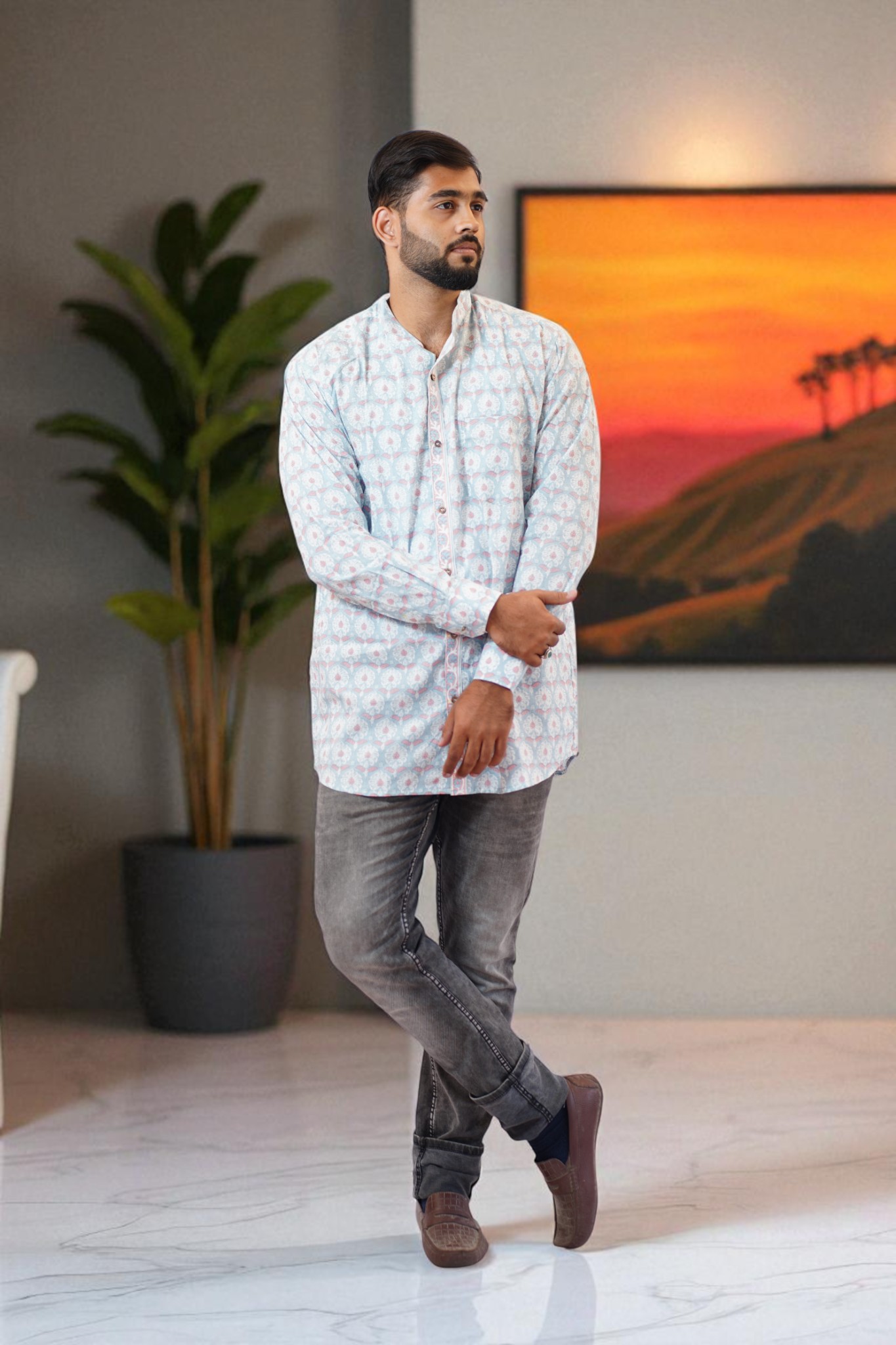 Where tradition meets a breezy bloom - A breezy sky-blue short kurta with handblock pink florals and a touch of traditional charm.