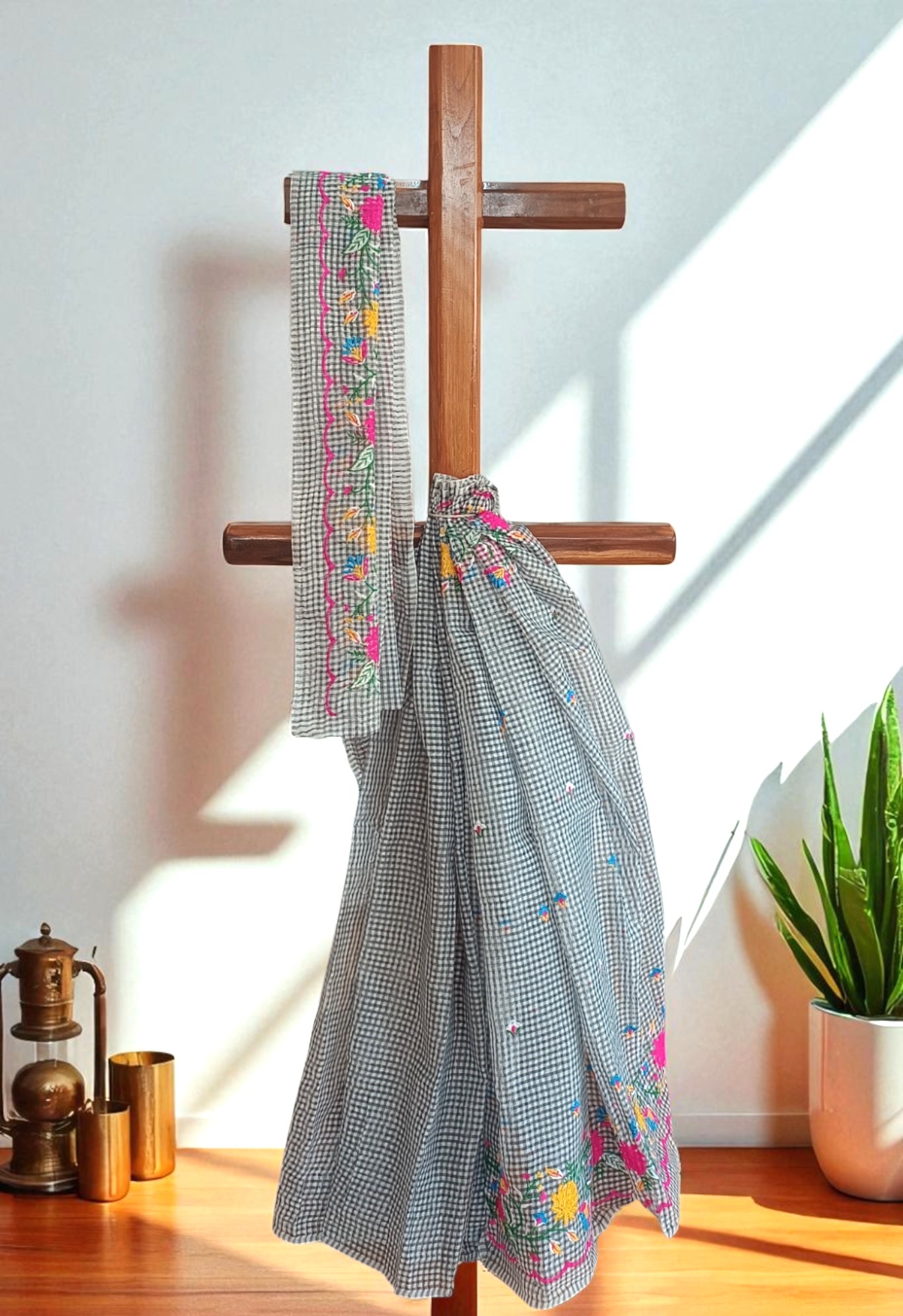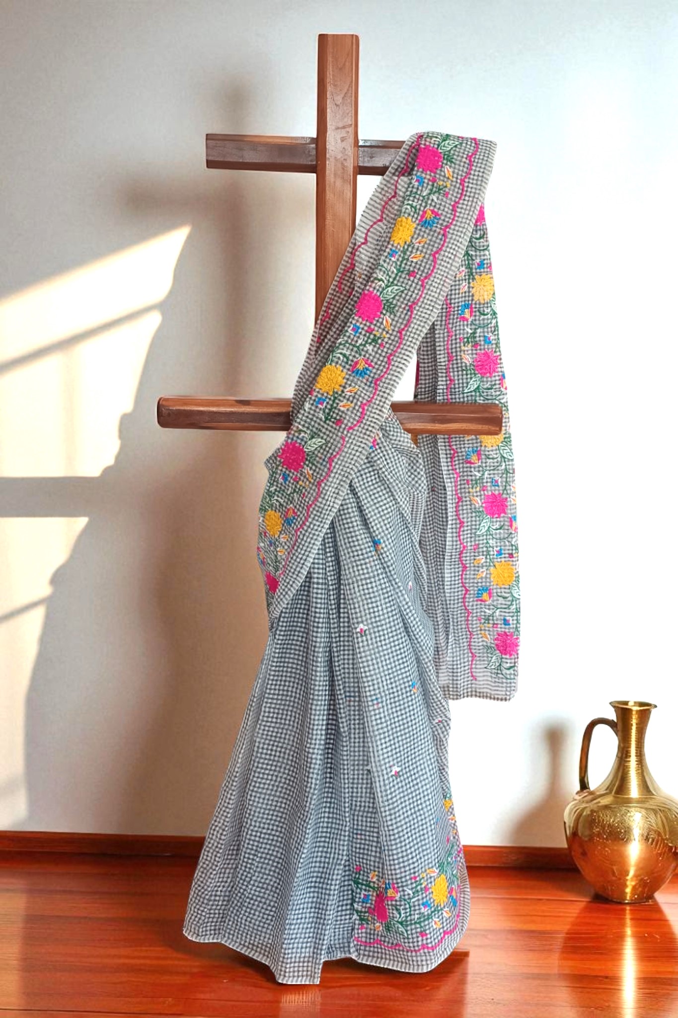 White Black Check Embroidery Kota Cotton Saree