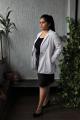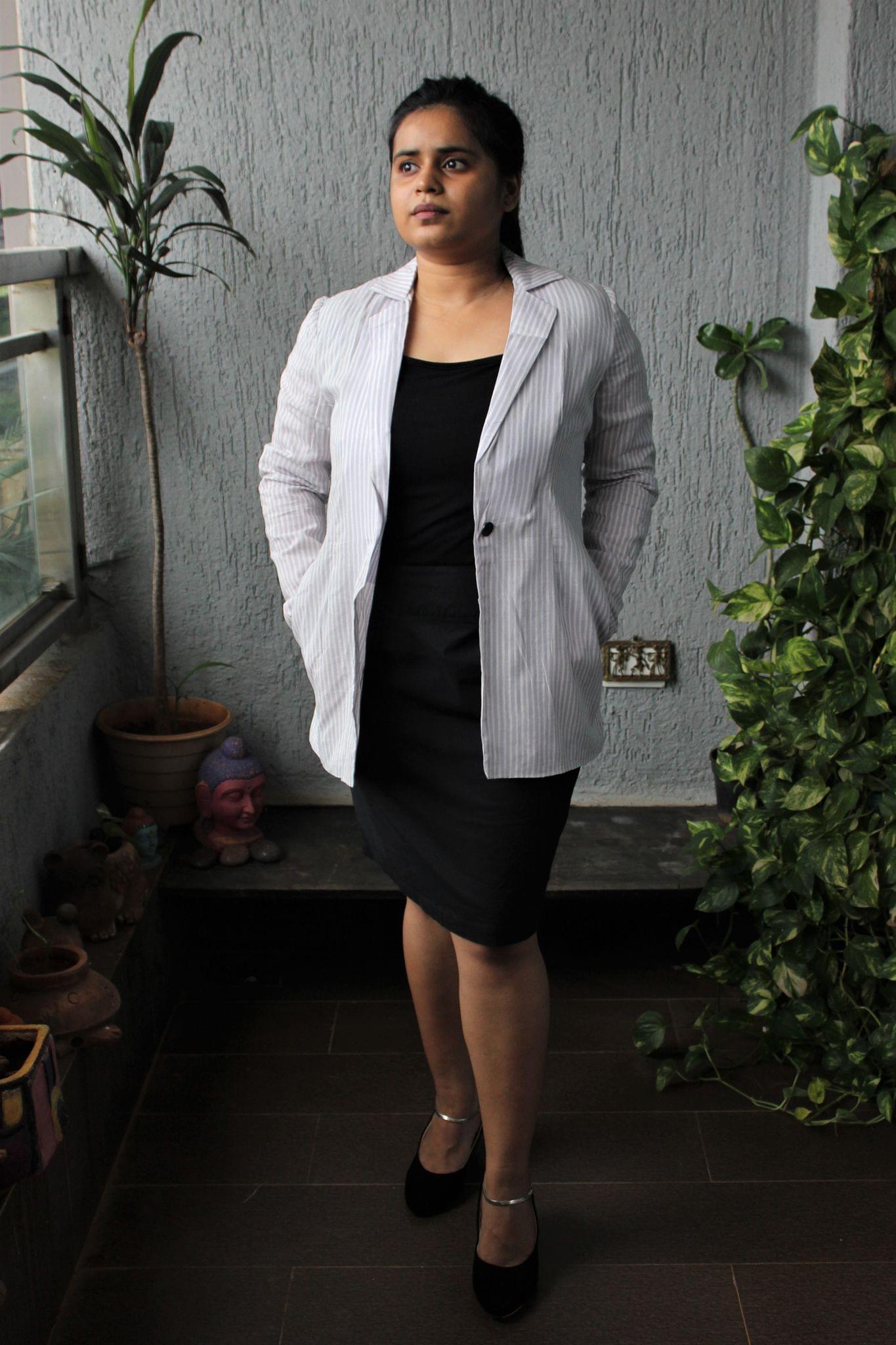 The Attire consists of Hand Block Print Cotton Cloud Grey & White Stripes Blazer.