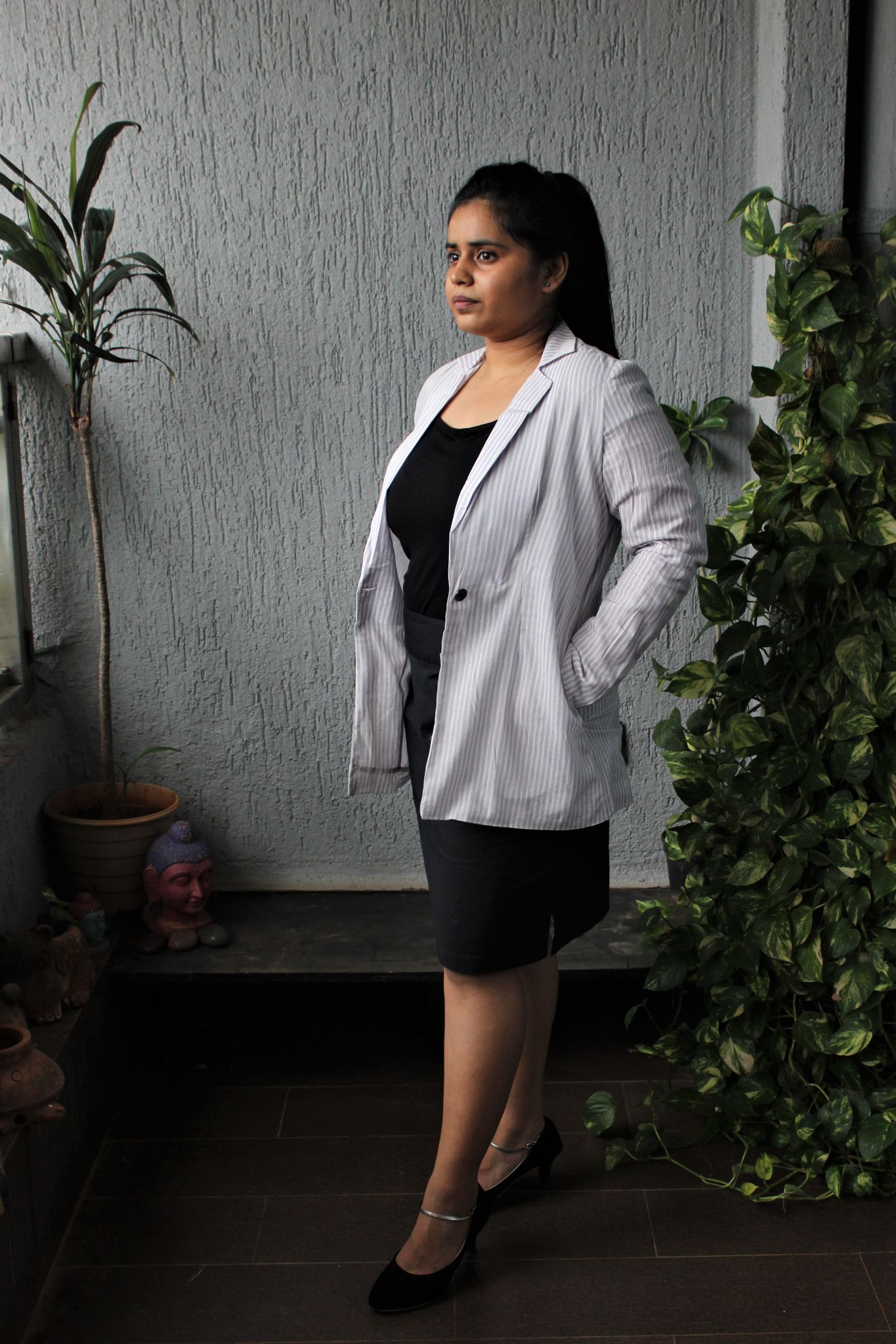 Blazer Design: The blazer could have a tailored, structured fit, often with lapels, a button closure, and pockets. It could be worn for both casual and semi-formal occasions.