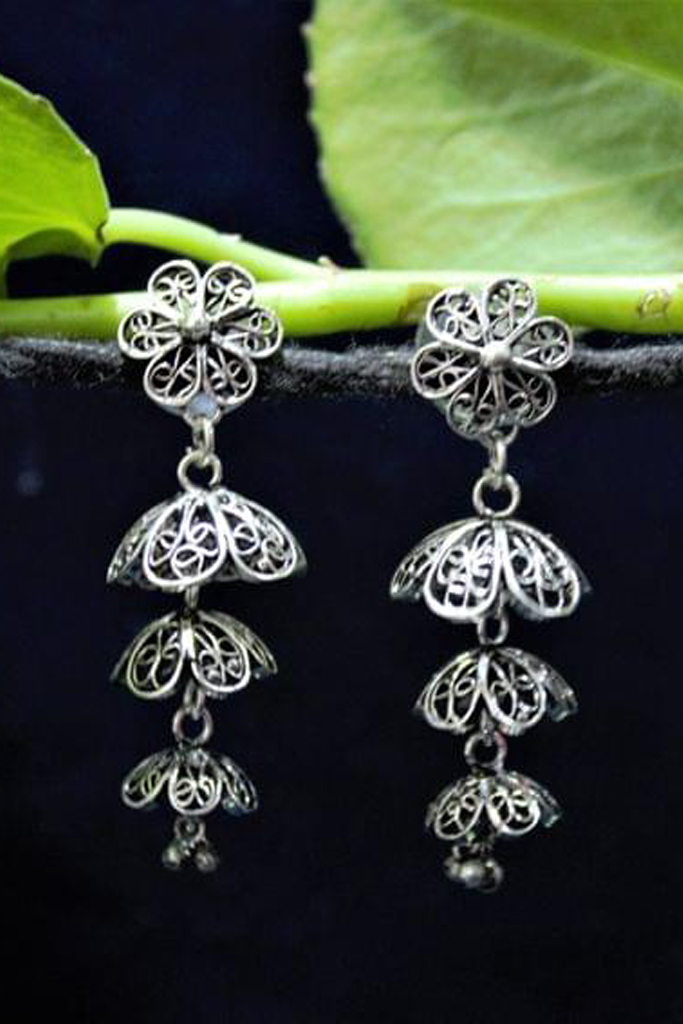 Oxidised Silver Filigree Tri Floral Jhumki